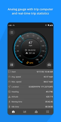 A dashboard with modern, analog speed gauge and trip computer showing current trip data as you drive. Check your average and max speed, current location (GPS coordinates – latitude and longitude), heading, elevation and trip time.