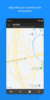 See your route and position on a map with markers indicating particular trip events like trip start, pause, end, GPS signal lost or found.