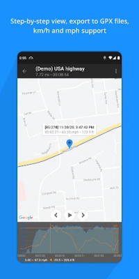 Advanced trip tracker with speed and altitude charts. Trip time summary and a timeline with important trip events (breaks, GPS signal lost, etc.).