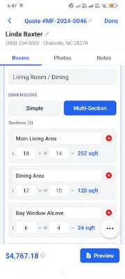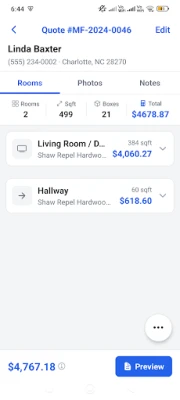Customers see what each room costs. Living Room, Kitchen, Hallway as clear line items. Builds trust, wins jobs.