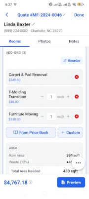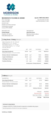 Clean, itemized quotes with your branding. Room breakdowns, clear totals, ready to send.