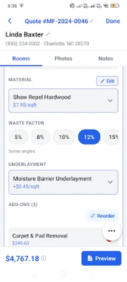 Floor Quote Pro handles the flooring math so you can focus on winning the job. Enter room dimensions, select materials from your price book, and send a clean PDF quote via text, email, or WhatsApp.